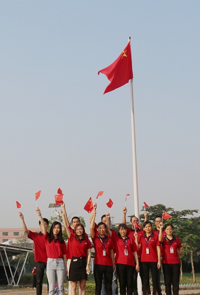 為熱烈慶祝新中國成立70周年,充分激發(fā)全體員工的愛國主義情懷,2019年9月30日上午,福日電子全資子公司深圳市中諾通訊有限公司在東莞以諾工業(yè)園區(qū)舉行了莊嚴(yán)的升國旗儀式。幾千名員工身著統(tǒng)一紅色司服,排著整齊的方陣。伴隨著雄壯的國歌聲,鮮艷的五星紅旗冉冉升起,全體員工滿懷崇敬之情向國旗行注目禮,愛國愛企的激情在大家心中激蕩。升旗儀式結(jié)束后,公司還組織員工開展“我與國旗”同框合影活動。