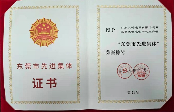 以諾通訊第三事業部運營中心生產部被授予“東莞市先進集體”榮譽稱號
