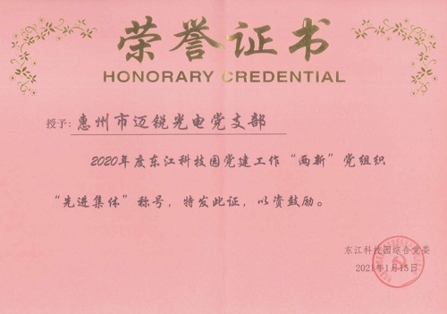 惠州邁銳黨支部榮獲“2020年度東江科技園 黨建工作‘兩新’黨組織先進集體”稱號