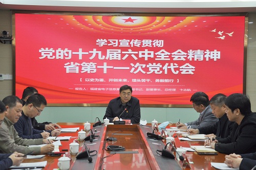 2021年12月31日,福建省電子信息集團(tuán)黨委副書記、副董事長、總經(jīng)理卞志航到福日電子作黨的十九屆六中全會(huì)精神、省第十一次黨代會(huì)精神專題宣講。集團(tuán)相關(guān)部室負(fù)責(zé)人、福日電子領(lǐng)導(dǎo)班子成員及各部門負(fù)責(zé)人等參加宣講會(huì)。