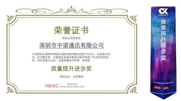 中諾通訊榮獲“聯想2022年度質量提升進步獎”