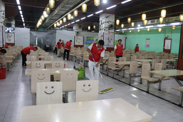 首先進(jìn)行的是公司食堂的清掃清潔。只見(jiàn)志愿者們有的手持抹布,有的揮舞拖把,有的幫忙換水,大家團(tuán)結(jié)協(xié)作分工有序埋頭苦干,對(duì)食堂的打菜窗口、桌椅板凳、地面墻角等處進(jìn)行深入清掃,做到不留衛(wèi)生死角。通過(guò)辛勤勞動(dòng),食堂的環(huán)境衛(wèi)生狀況得到改善,面貌煥然一新。